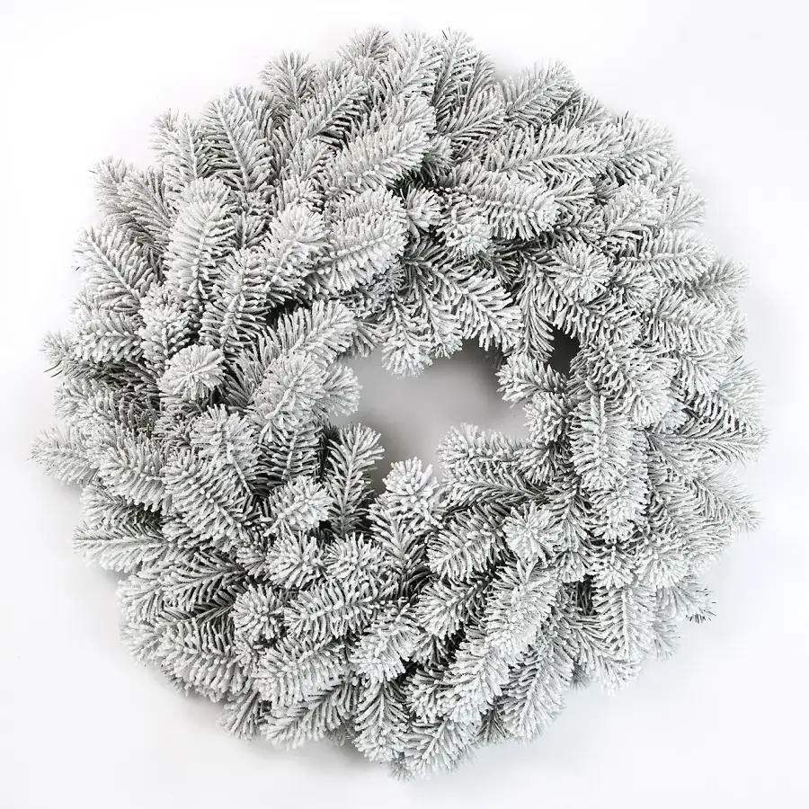 Новорічний декоративний вінок діаметром 60 см являє собою переплетені гілки штучної ялинки. Без декора. Виготовлений з 100% литої хвої. Голочки як у живої ялинки, але м'які і не колючі. Об'ємне густе напилення на вінку, реалістично імітує сніг, тільки що впав на гілки пухнастими пластівцями. Матеріалом розпилення є натуральна бавовна, вона екологічна і не має запаху, безпечна для дітей і дорослих.