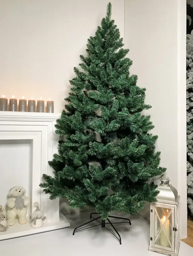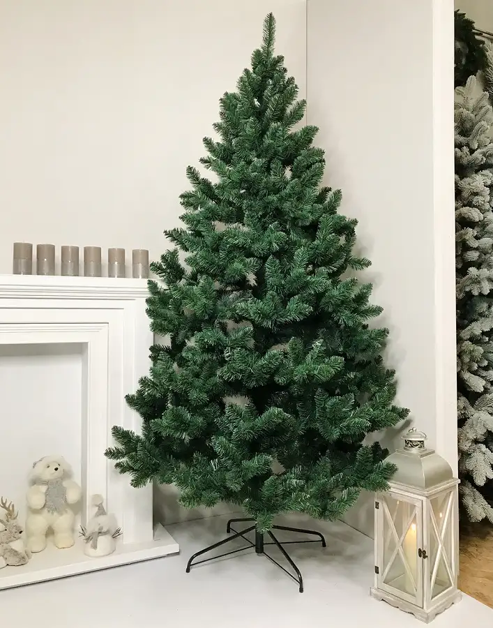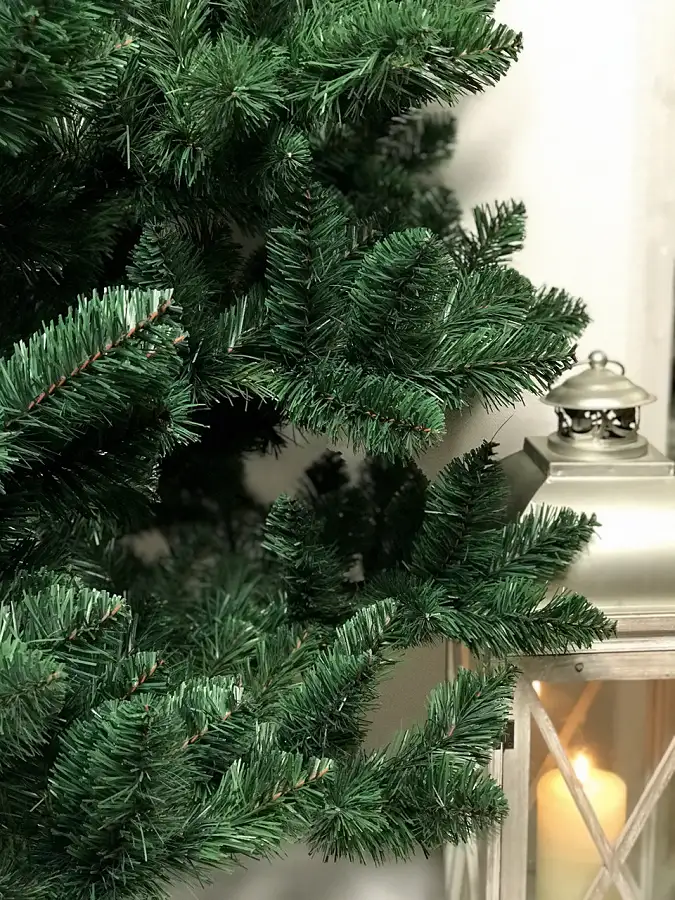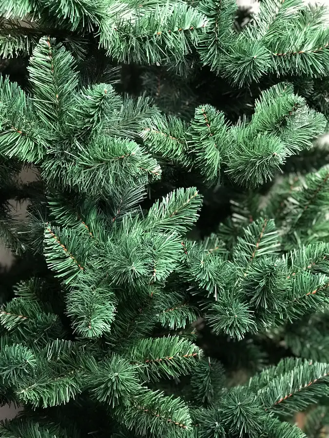Надзвичайно пишна новорічна красуня. Густі гілки з чотирьох шарів полімерної плівки мають гарну загострену на кінчиках форму. Хвоя зеленого кольору, а серединка гілки коричнева, як у живої ялинки.