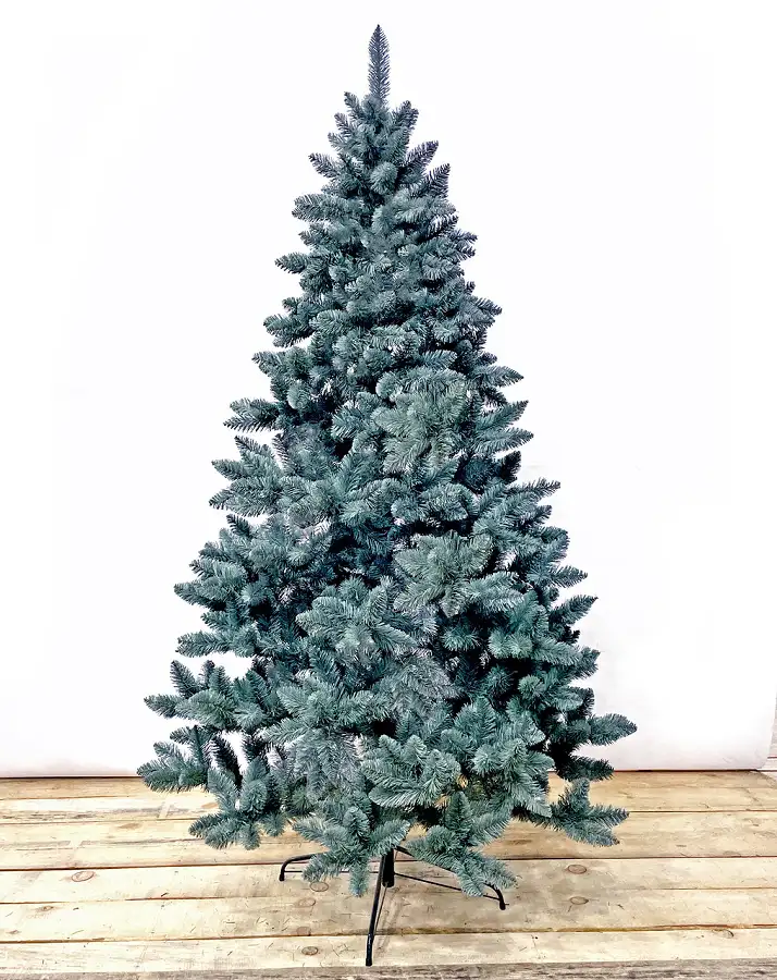 Надзвичайно пишна новорічна красуня. Густі гілки з чотирьох шарів полімерної плівки мають гарну загострену на кінчиках форму. Хвоя благородного блакитного кольору, як у живої ялинки.