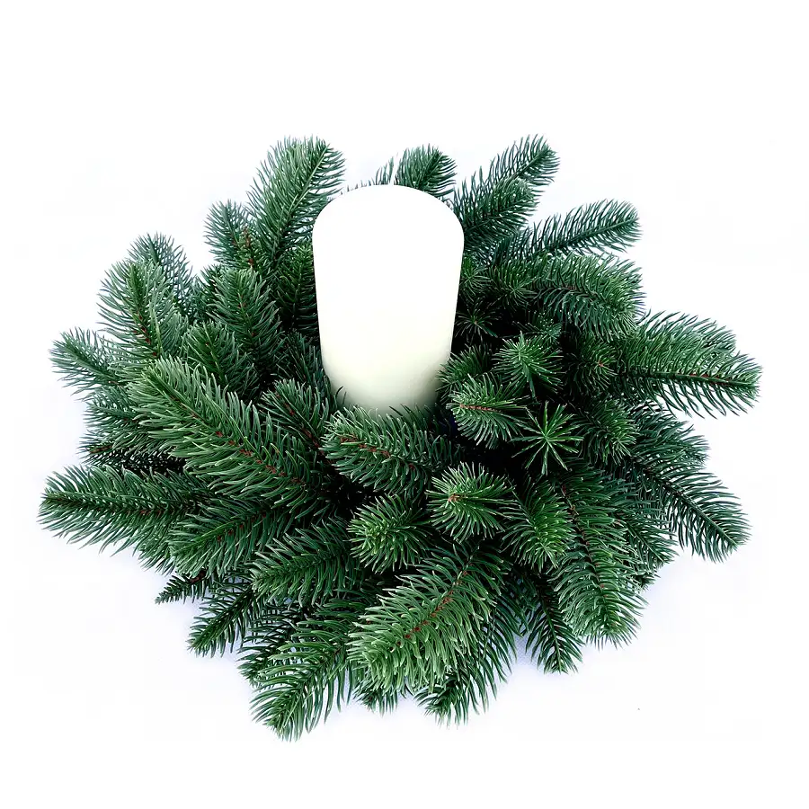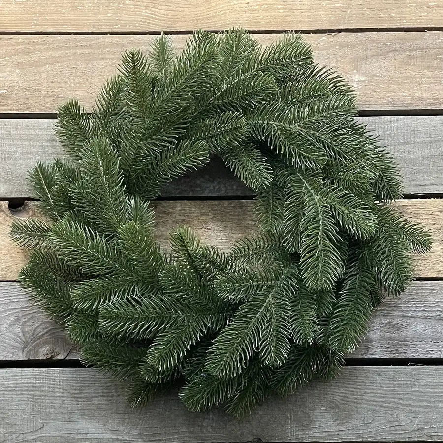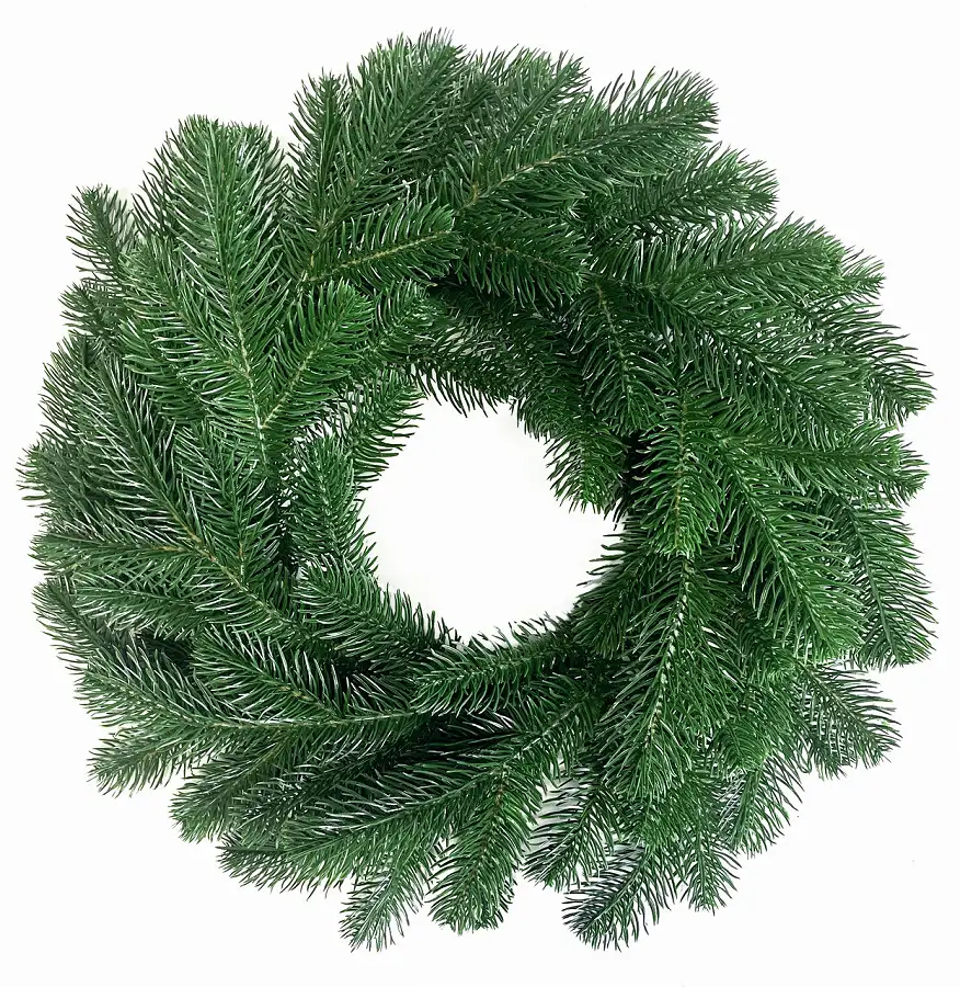 Новорічний декоративний вінок діаметром 40 см являє собою переплетені гілки штучної ялинки. Виготовлений з 100% литої хвої. Голочки як у живої ялинки, але м'які і не колючі. Без декору.