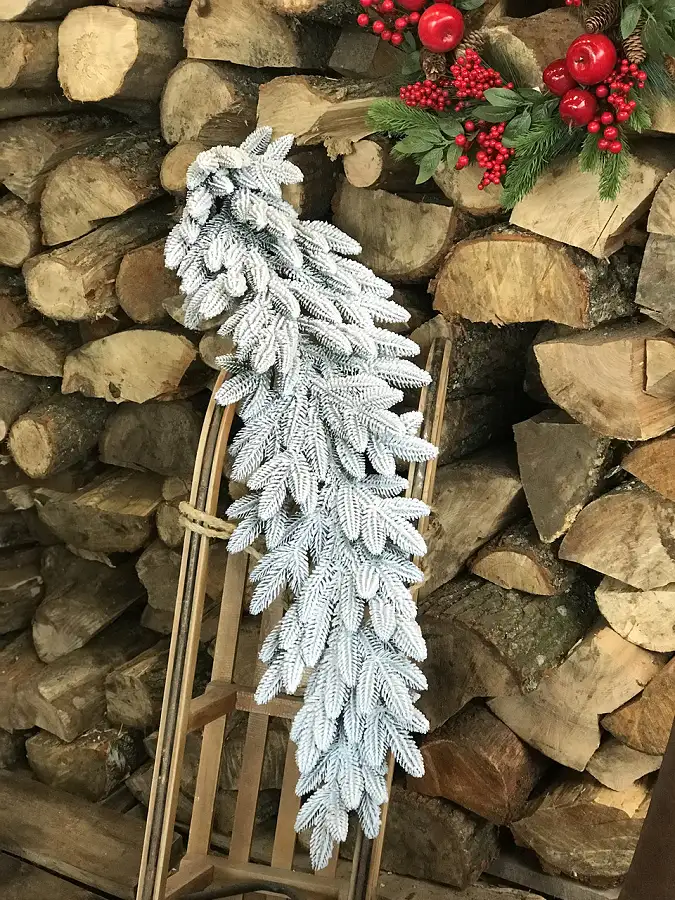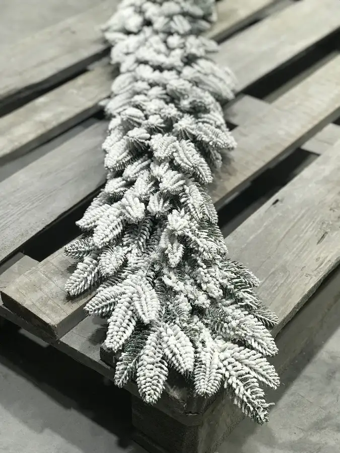 Хвойна гірлянда виготовлена з переплетених штучних ялинових гілочок. Всі гілки і голочки - 100% литі, вони виглядають, як хвоя живої ялинки, але м'якші і не колючі. Об'ємне густе напилення реалістично імітує сніг, який щойно впав на гілки пухнастими пластівцями. Матеріалом розпилення є натуральна бавовна, вона екологічна і не має запаху, безпечна для дітей і дорослих.