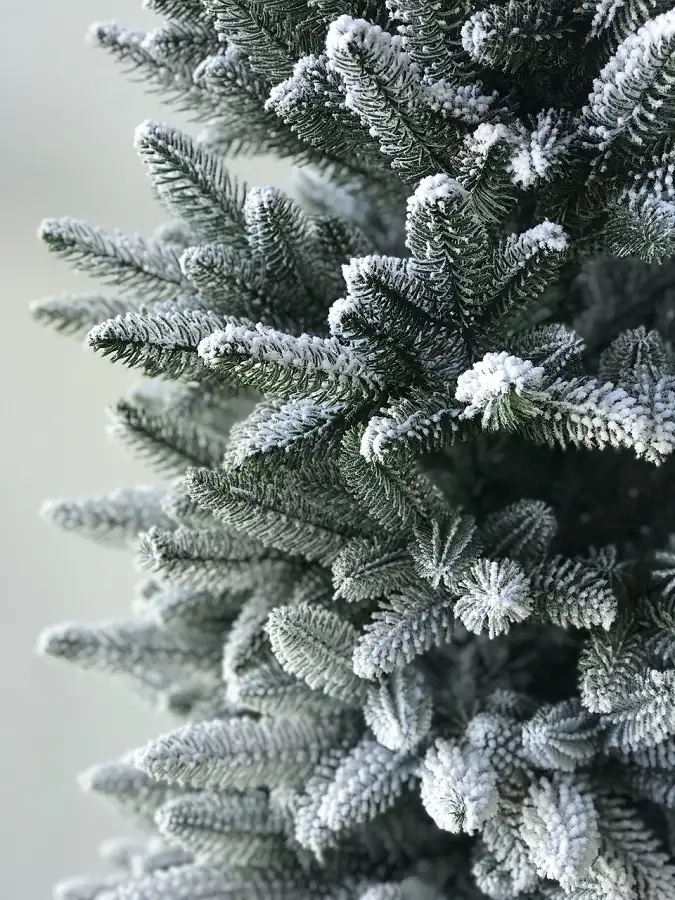 Всі голочки - литі, точна 3D імітація хвої живої ялинки. Об'ємне густе напилення на ялинці реалістично імітує сніг, який тільки що впав на гілки пухнастими пластівцями. Матеріалом розпилення є натуральна бавовна, вона екологічна і не має запаху, безпечна для дітей і дорослих.