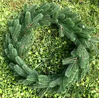 Новорічний декоративний вінок діаметром 50 см являє собою переплетені гілки штучної ялинки. Виготовлений з 100% литої хвої. Голочки як у живої ялинки, але м'які і не колючі. Без декору.