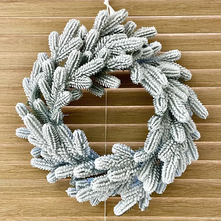 Новорічний декоративний вінок діаметром 50 см являє собою переплетені гілки білої штучної ялинки. Виготовлений з 100% литої хвої. Голочки як у живої ялинки, але м'які і не колючі. Без декору.