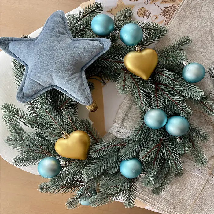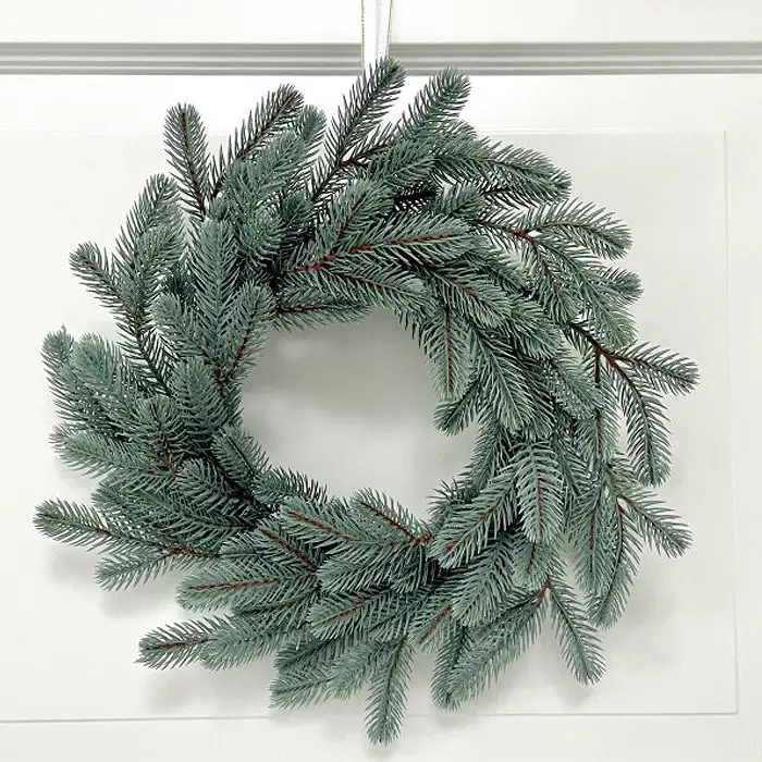 Декоративний різдвяний вінок виготовлений з переплетених гілок штучної ялинки. Він виготовлений з 100% литої хвої, а його голочки нагадують живу ялинку, але вони більш м'які та не колючі.