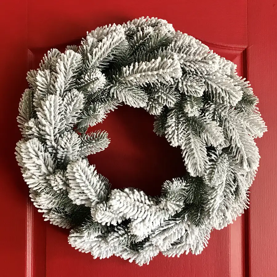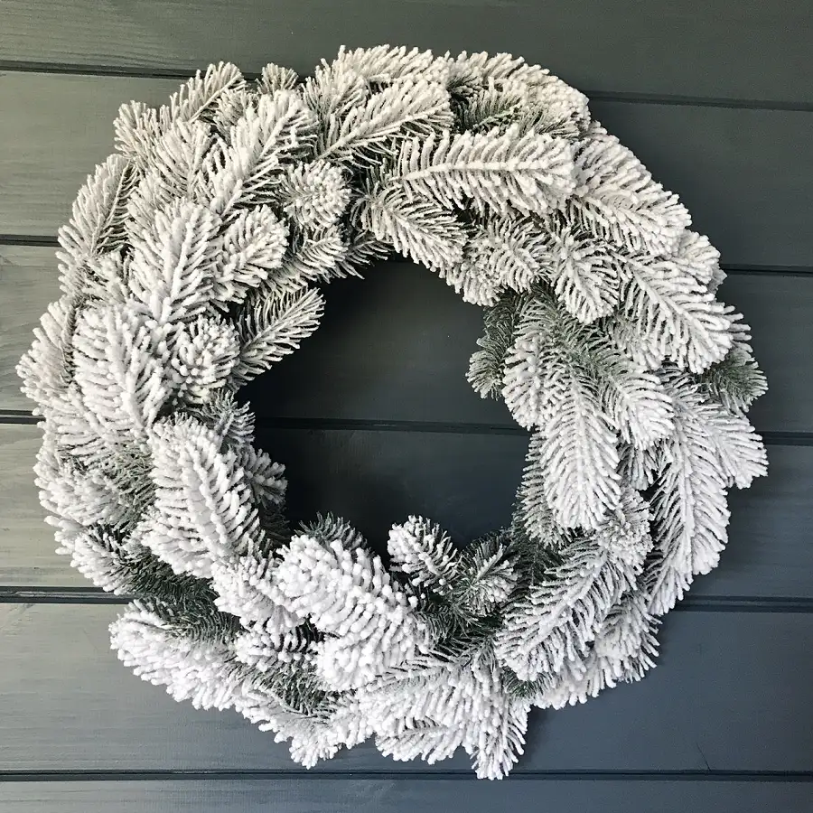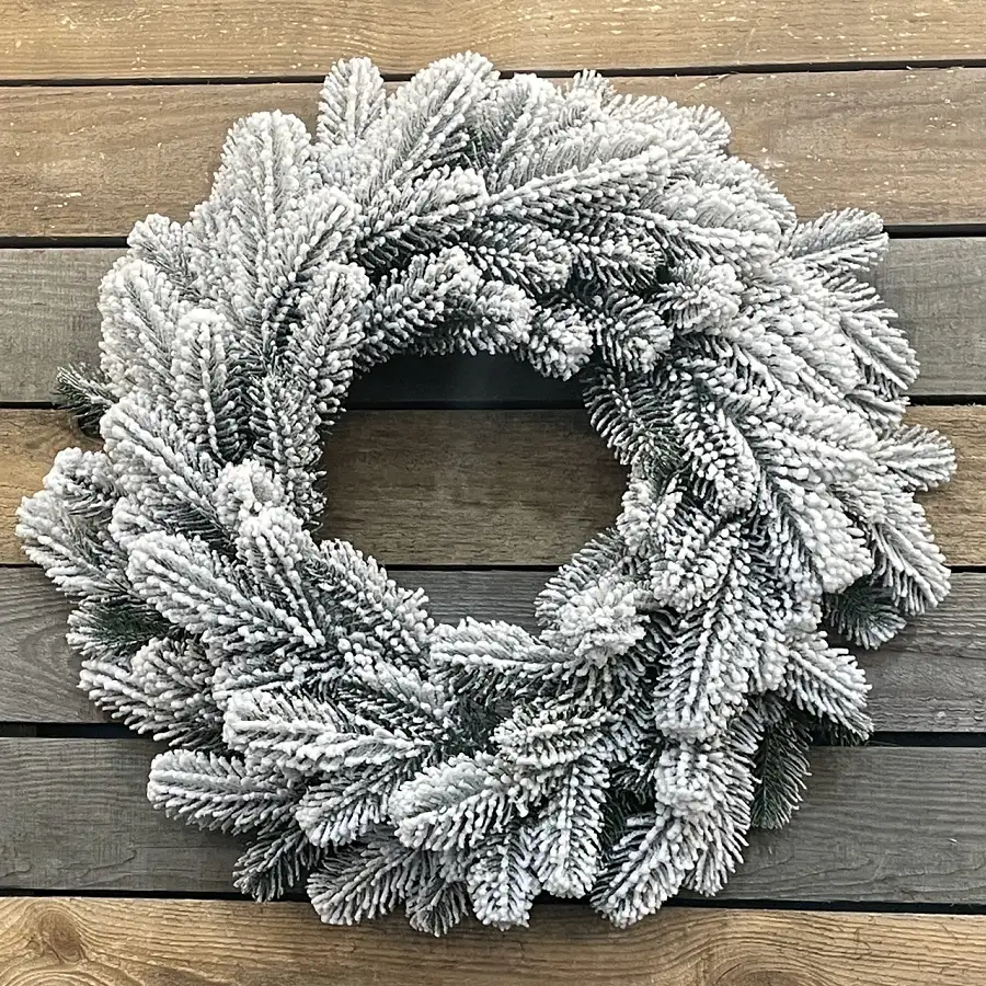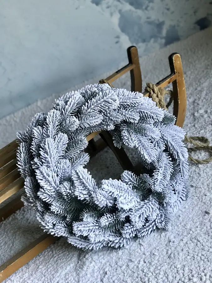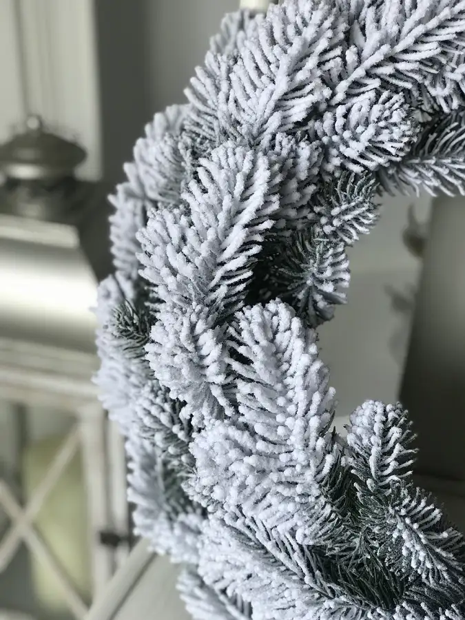 Декоративний різдвяний вінок виготовлений з переплетених гілок штучної ялинки. Він виготовлений з 100% литої хвої, а його голочки нагадують живу ялинку, але вони більш м'які та не колючі. Об'ємне густе напилення на вінку, реалістично імітує сніг, який тільки що впав на гілки пухнастими пластівцями. Матеріалом розпилення є натуральна бавовна, він екологічний і не має запаху, безпечний для дітей і дорослих.