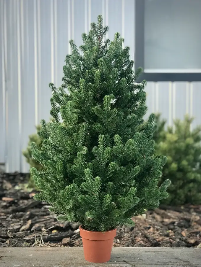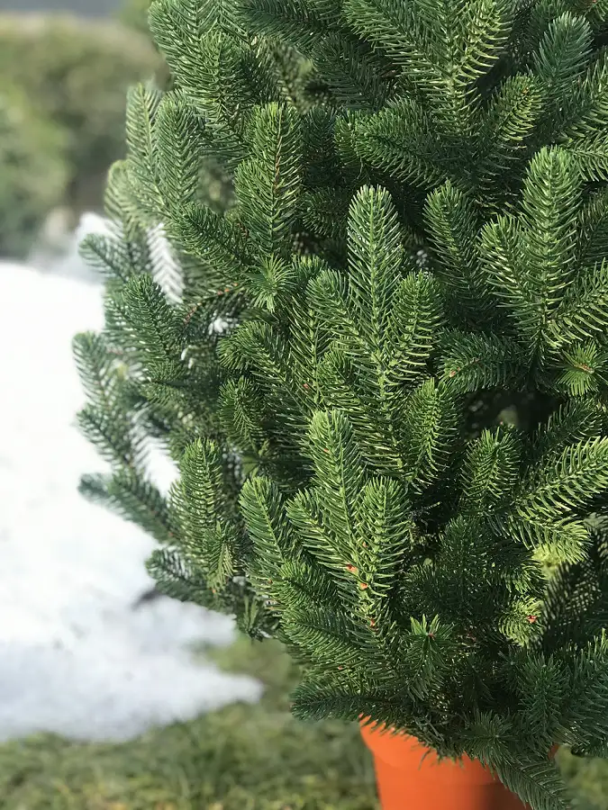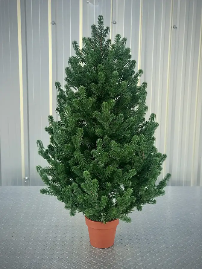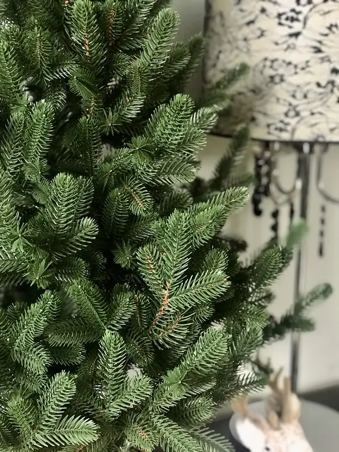 Ця унікальна ялинка має густу конічну крону, схожу на конус, з вершиною, що спрямована вгору, і гілками, що ростуть від стовбура до вершини рослини, створюючи витончену структуру стовбура. Використання високоякісного пластику та інноваційної технології лиття роблять хвою та гілки надзвичайно реалістичними.