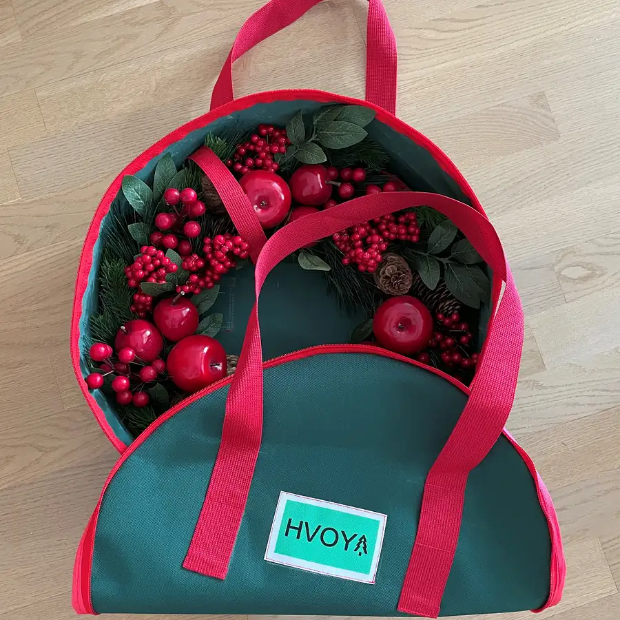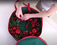 Компактна сумка-чохол для новорічного вінка або гірлянди, має зручні ручки для перенесення та надійну блискавку. Усередині чохла – стрічки із спеціальними застібками-фастексами, що забезпечують відмінну фіксацію вінка.