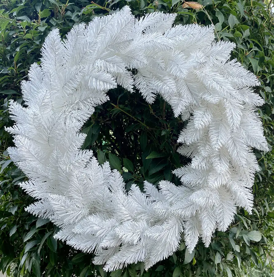 Білі гілочки різдвяного вінка серії Elegant мають кінчики загостреної форми. Вінок виготовлений з м'якого пластику ПВХ. Діаметр вінка по зовнішньому краю 50 см.