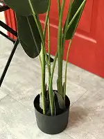Виготовлена із високоякісного пластику та тканини, ця рослина є стійкою та придатною для тривалого використання. У комплекті входить чорний пластиковий горщик, приклеєний до основної декорації. При бажанні рослину можна помістити в інший, більший горщик на ваш вибір.