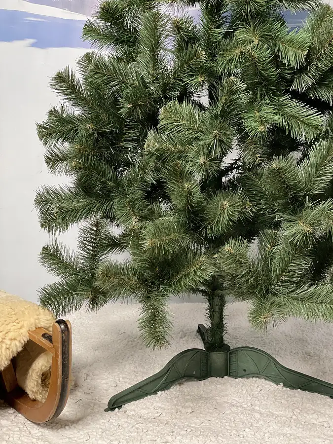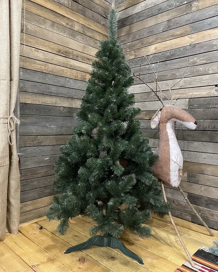 Штучна новорічна ялинка звичайна - чудовий і не дорогий варіант для святкування Різдва та Нового року. Виготовлена з якісної плівки ПВХ, має природний зелений колір гілочок. Ялинка складається з двох частин. Її легко встановити за допомогою стійкої пластикової підставки. Висота ялинки з підставкою - 180 см.