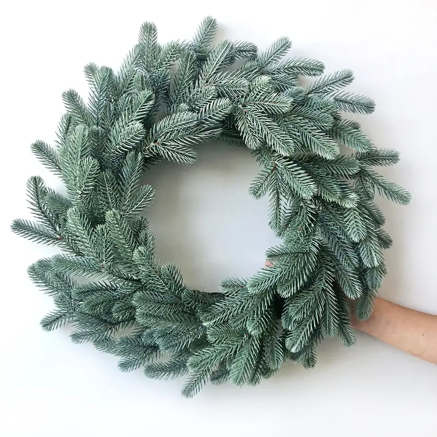 Новорічний декоративний вінок діаметром 40 см виготовлений з 100% литої хвої, яка надає йому природного вигляду. Гілки штучної ялинки переплітаються в красиву, пишну композицію, яка нагадує живу хвою, але є м'якою і безпечною на дотик. Вінок поставляється без декору, що дозволяє вам самостійно прикрасити його відповідно до власного стилю.