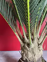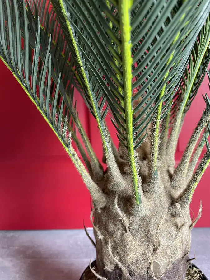 Цикас, також відомий як саговник, – це унікальна та екзотична рослина, яка відразу привертає увагу своїм незвичайним виглядом. Вона має густу розетку темно-зелених, блискучих листків, що нагадують пальмові. Листя цикаса має характерний перистий вигляд: кожен лист складається з численних вузьких листочків, розташованих по обидва боки центрального стебла. Це створює розкішний, розлогий ефект, що додає простору відчуття тропічної елегантності.