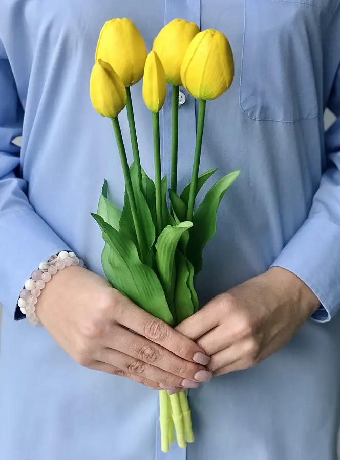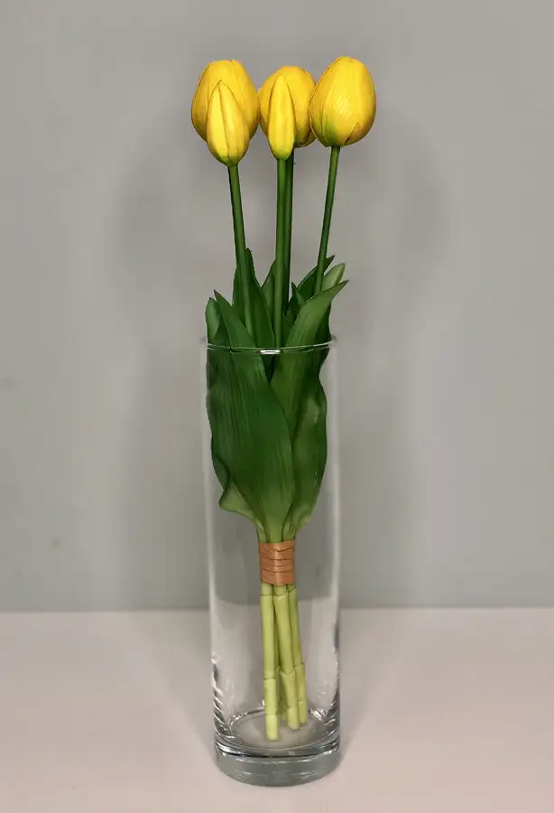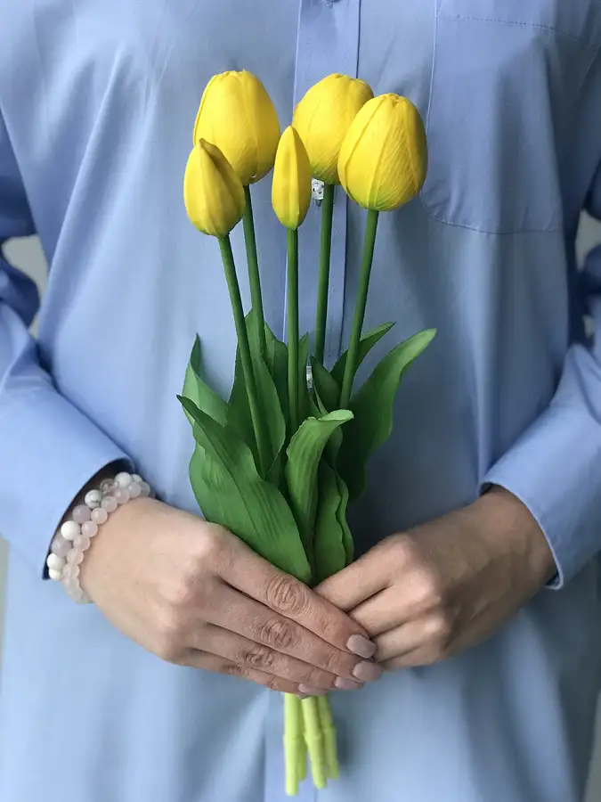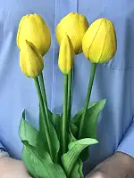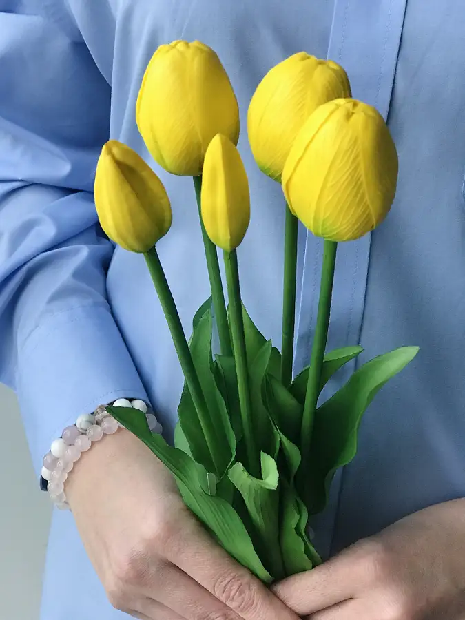 Тюльпани штучні латексні жовті - це чудовий варіант для декору кімнати або подарунку. Букет складається з 5 бутонів Real Touch, які мають неймовірно реалістичний вигляд і на дотик схожі на живі квіти.