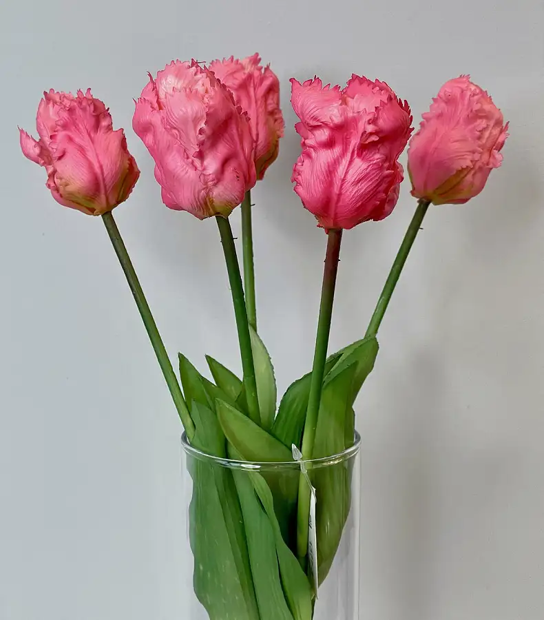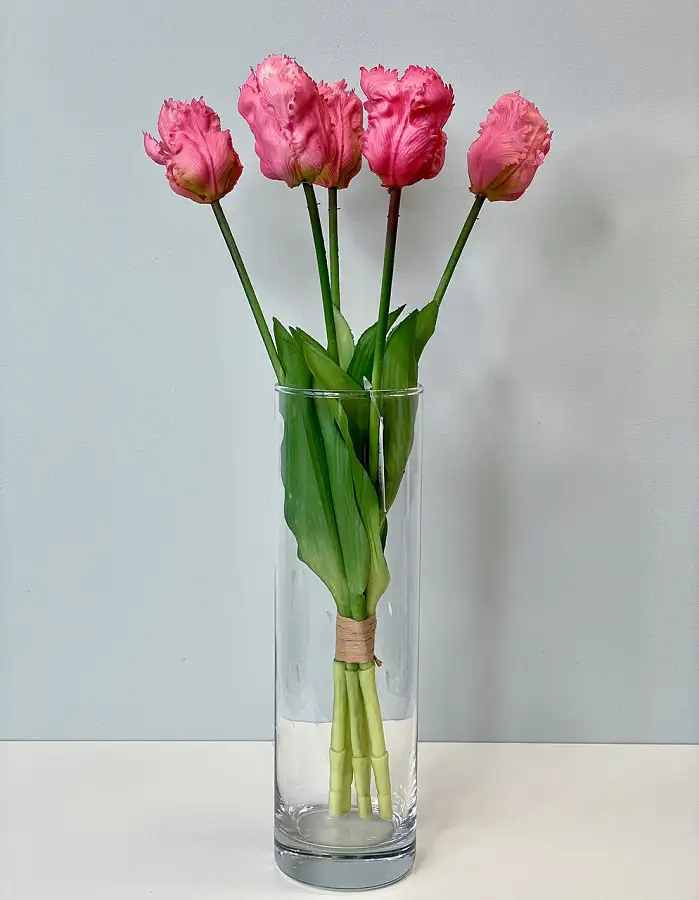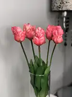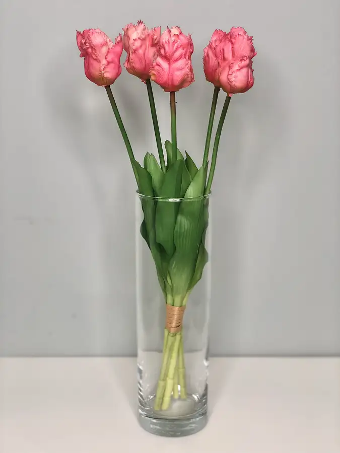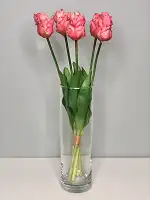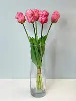 Тюльпани штучні латексні махрові букет складається з 5 квіток рожевого кольору. Ці штучні квіти дуже схожі на живі завдяки використанню латексу виготовленням. Вони ідеально підходять для декорування будь-яких приміщень або подарунком вашим близьким. Кожен квітка має деталізовані пелюстки, які надають їм реалістичний вигляд.