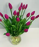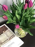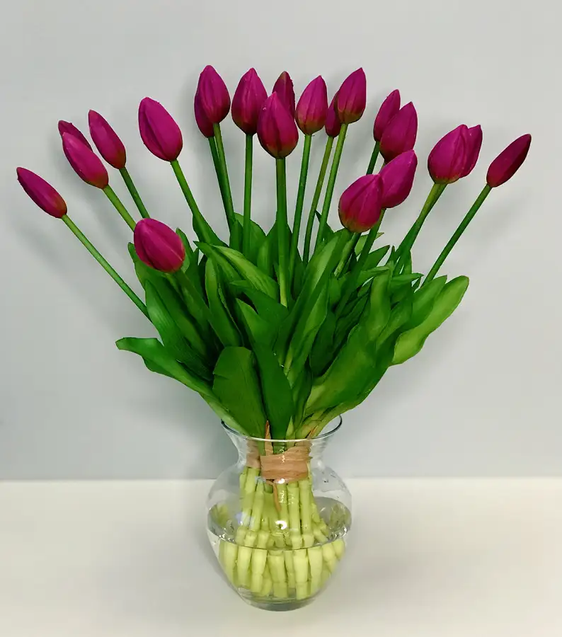 Завдяки високоякісному латексу, тюльпани мають реалістичний вигляд і приємну бархатисту текстуру. Гнучкі стебла дозволяють змінювати форму букета, адаптуючи його під будь-яку вазу чи квіткову композицію. Букет можна ставити у вазу з водою – і квіти виглядатимуть, як щойно зрізані!