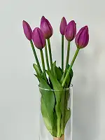 Це чудовий букет із 7 закритих бутонів фіолетових штучних латексних тюльпанів Real Touch. Кожен бутон виготовлений з високоякісного матеріалу, що надає їм реалістичний вигляд і дозволяє відчувати їх, ніби це справжні квіти. Ці штучні тюльпани стануть чудовим доповненням до будь-якого інтер'єру та подарунком на будь-яку подію.