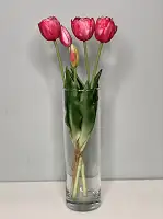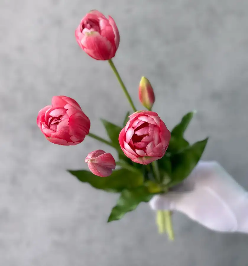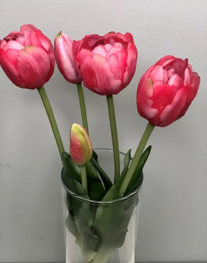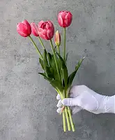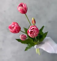 Штучні тюльпани латексні махрові - це високоякісні квіти, які виготовлені з латексу і мають природний вигляд. Букет складається з 5 квітів яскраво-рожевого кольору, що додасть приміщенню елегантності та свіжості.