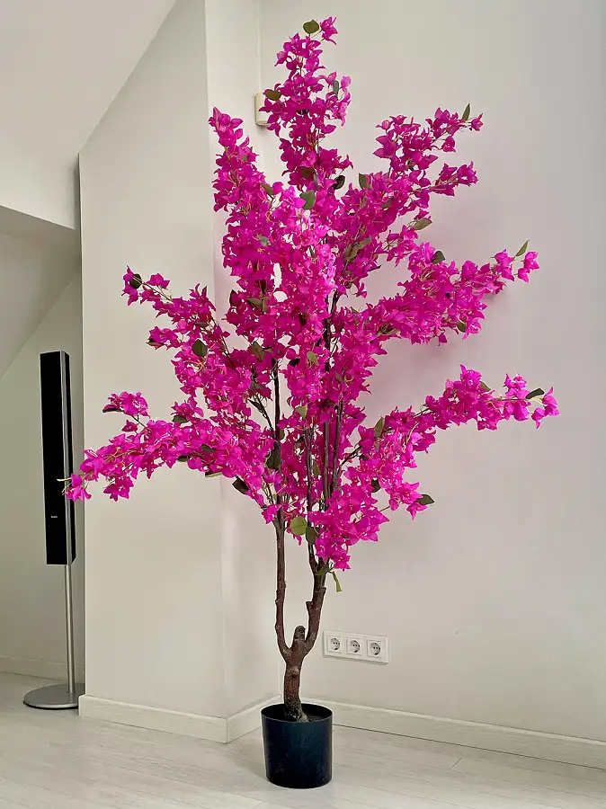Штучна бугенвілія — це розкішне декоративне дерево з пишною кроною та неймовірно реалістичним виглядом. Вона стане головною окрасою вашого інтер’єру, привертаючи увагу своєю насиченою рожевою палітрою та ніжними текстурованими пелюстками. Дерево створює атмосферу затишку та вишуканості, додаючи простору екзотичного шарму.
