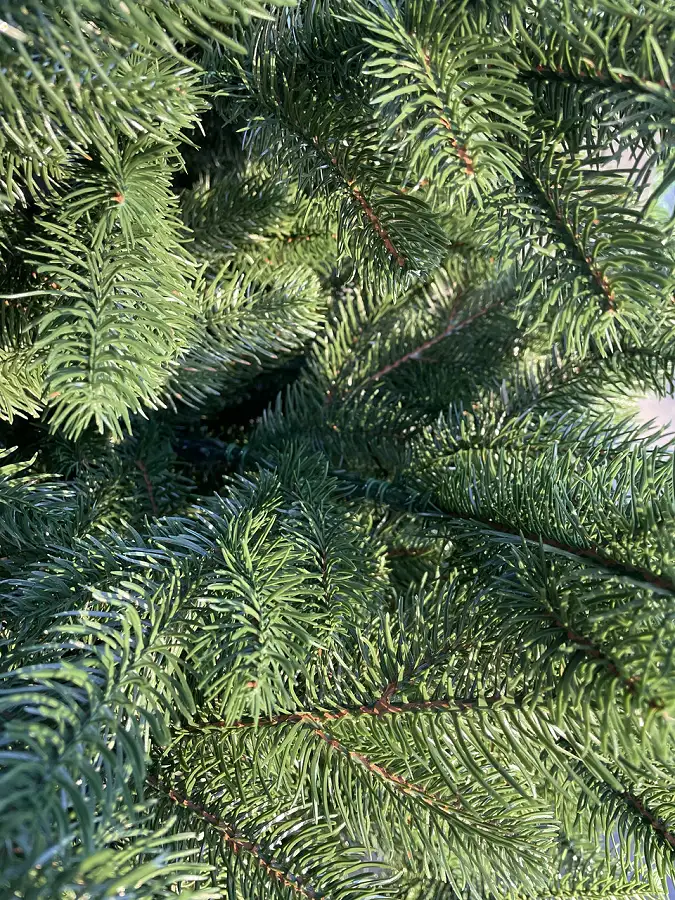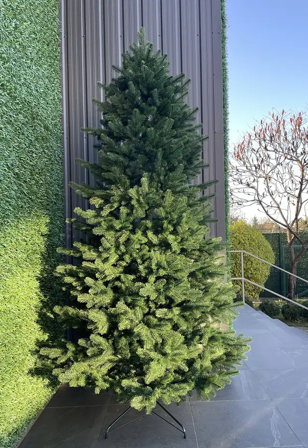 Ялинка складається з трьох частин, що робить процес складання та зберігання максимально зручним. Міцна металева підставка забезпечує стабільність і надійність. Ширина нижнього яруса становить 155 см, що додає дереву пишності та гармонійних пропорцій.