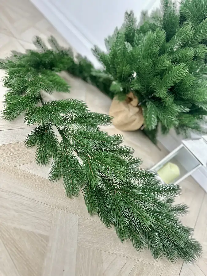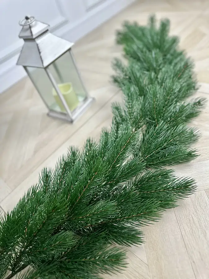 Гірлянда легко набуває необхідної форми та зберігає охайний вигляд упродовж усього сезону. Вона не обсипається, не має запаху та не потребує спеціального догляду. Завдяки гнучкій основі її зручно розміщувати на камінах, сходах, полицях, вітринах та у фотозонах. Натуральний зелений колір дозволяє легко поєднувати гірлянду з будь-яким новорічним декором — іграшками, стрічками, шишками чи світловими гірляндами.