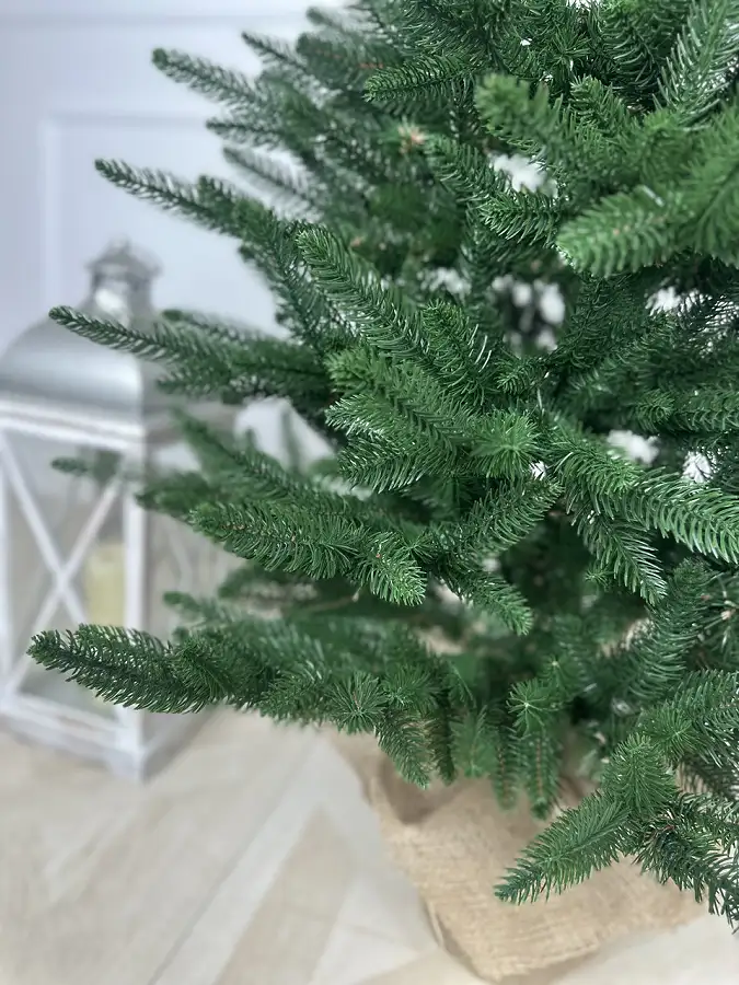 Ялинка оздоблена натуральною мішковиною, що надає їй затишного, декоративного характеру та дозволяє гармонійно вписатися в сучасні інтер’єри — від класичних і скандинавських до еко-стилю.