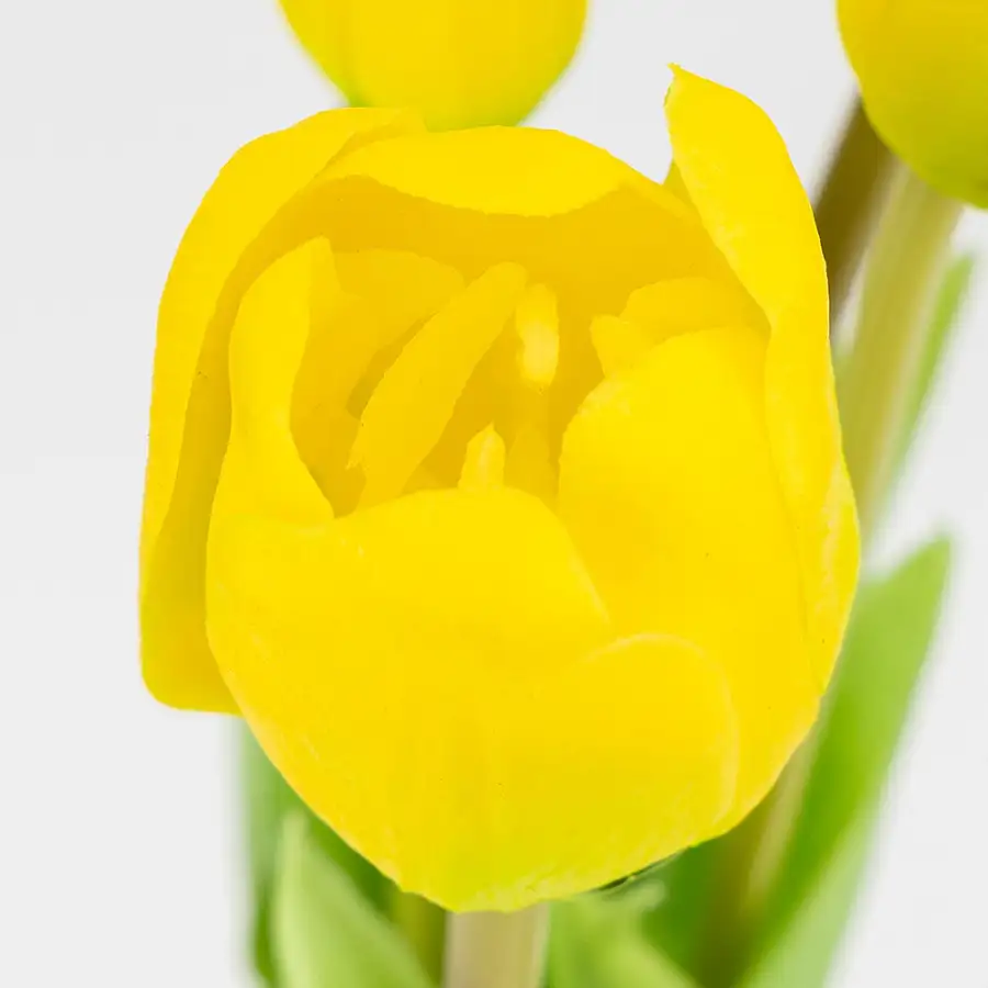 Ці тюльпани не в’януть і не потребують догляду, дозволяючи надовго створити ефект живих квітів у просторі. Жовто-зелений колір додає інтер’єру світла, тепла і весняного настрою, роблячи композицію стильним і універсальним елементом декору.