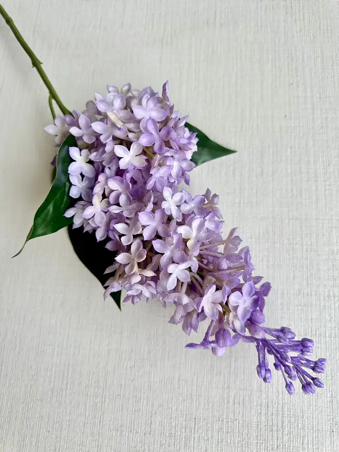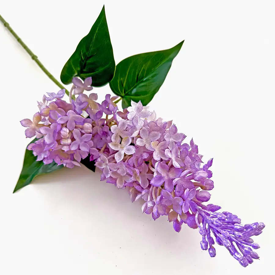 Реалістична гілка бузку з латексними квітами та декоративним листям. М’який латекс надає пелюсткам природну форму та фактуру, завдяки чому квіти виглядають максимально наближеними до живих.